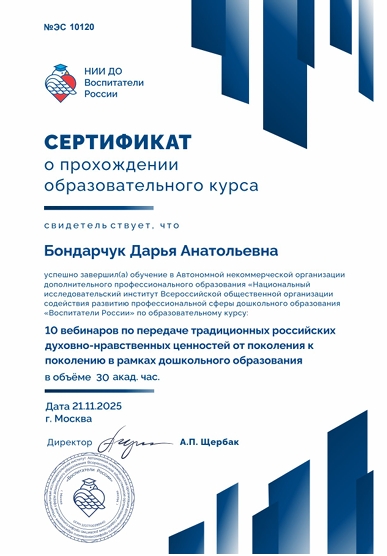 - "Передача традиционных российских духовно-нравственных ценностей от поколения к поколению в рамках дошкольного образования", 30 часов, 2025 г.